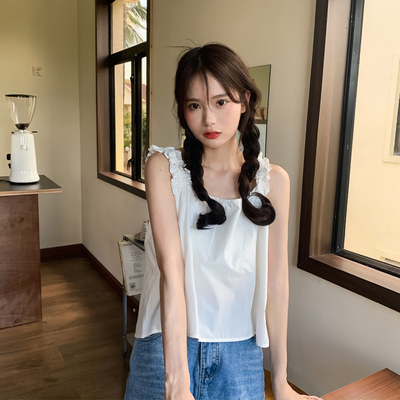 Real price real shot 2021 new design pure color vest Female Minority square collar wooden ear edge sleeveless top summer