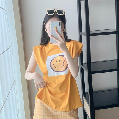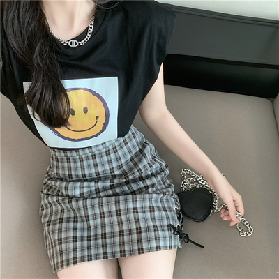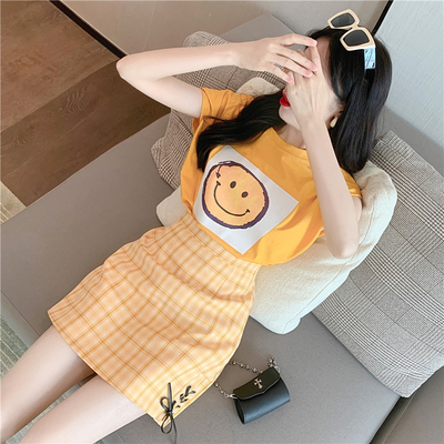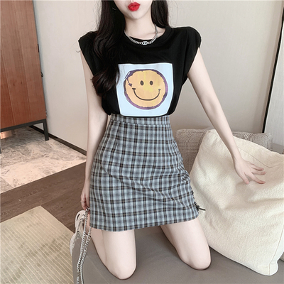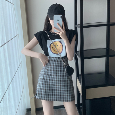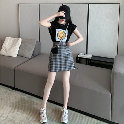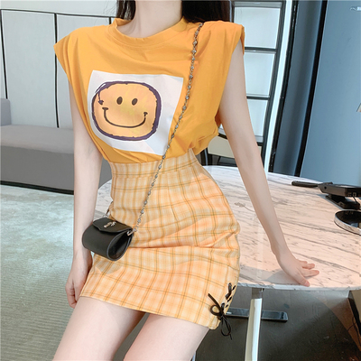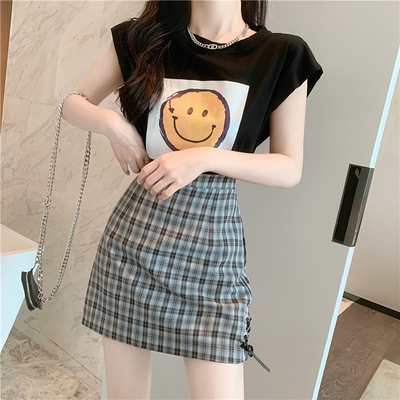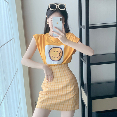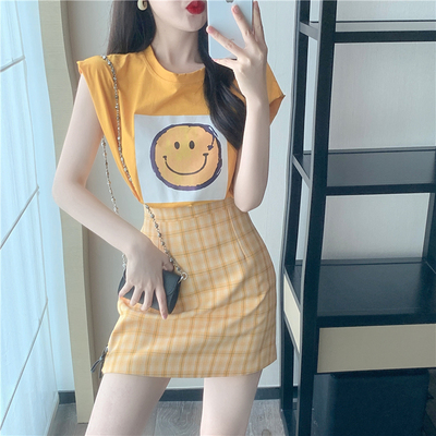 Real price new fashion design with shoulder sleeve smiling face top + high waist and thin buttock skirt