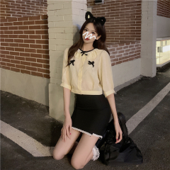 Real price sweet bow thin Mini transparent short sleeve shirt + hip skirt suit