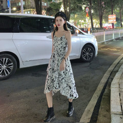 Real price ~ minority French floral suspender dress women's irregular ear edge splash ink skirt