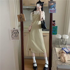 Real price mid long summer frock retro college style back belt skirt + apricot top suit