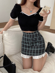 Xuejie's heart attack! Short French top + Green Plaid lace skirt 2021