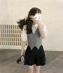 Real time Plaid vest bubble sleeve shirt three piece black high waist pleated skirt