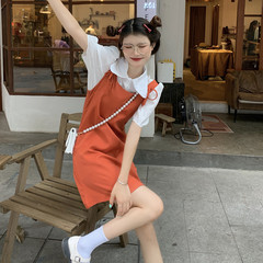 Real shot age reduction baby collar white bubble sleeve shirt + design BOW STRAP skirt
