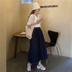 Real price lace cut-out V-neck Top + denim skirt