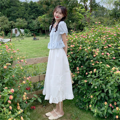 Real shot short sleeve shirt with square collar and ear edge and bubble sleeve + White Ruffle Skirt