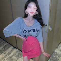 Korean loose captioned printed 7-point sleeve T-shirt Korean irregular high waist thin skirt
