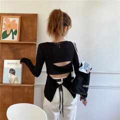 Real shot real price ~ versatile show thin wave edge lace up long sleeve T-shirt